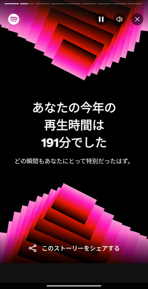 下の画像は今年のSpotify まとめのスクリーンショットです。Spotify まとめ2025の内容は、より一層視覚的なインパクトがあります。Spotify まとめ2025の詳細が気になる方は、ぜひスマホの中のSpotifyを開いて自分のSpotify まとめをチェックしてみてください!